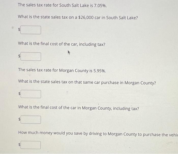 Solved The Sales Tax Rate For South Salt Lake Is 7 05 What Is The State Sales Tax On 523 500 Car In South Salt Lake What Is The Final Cost Of The Car